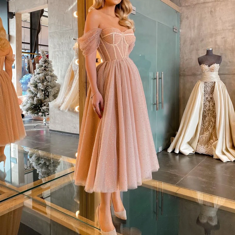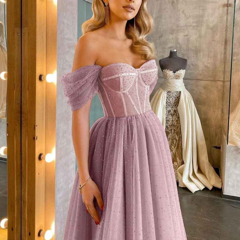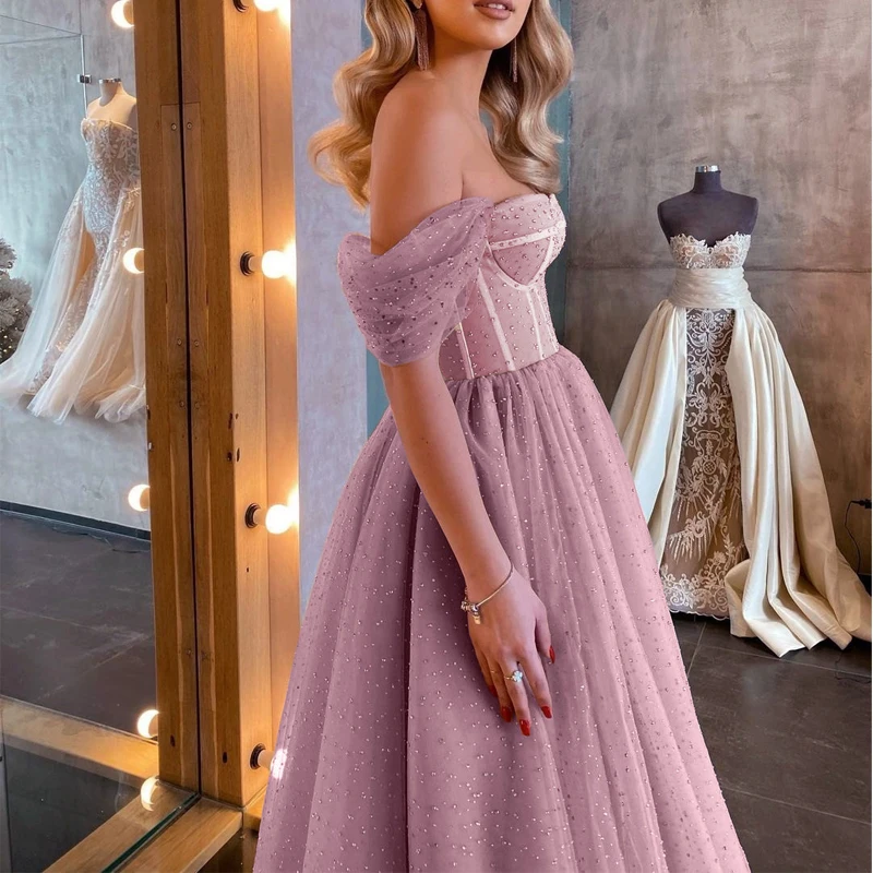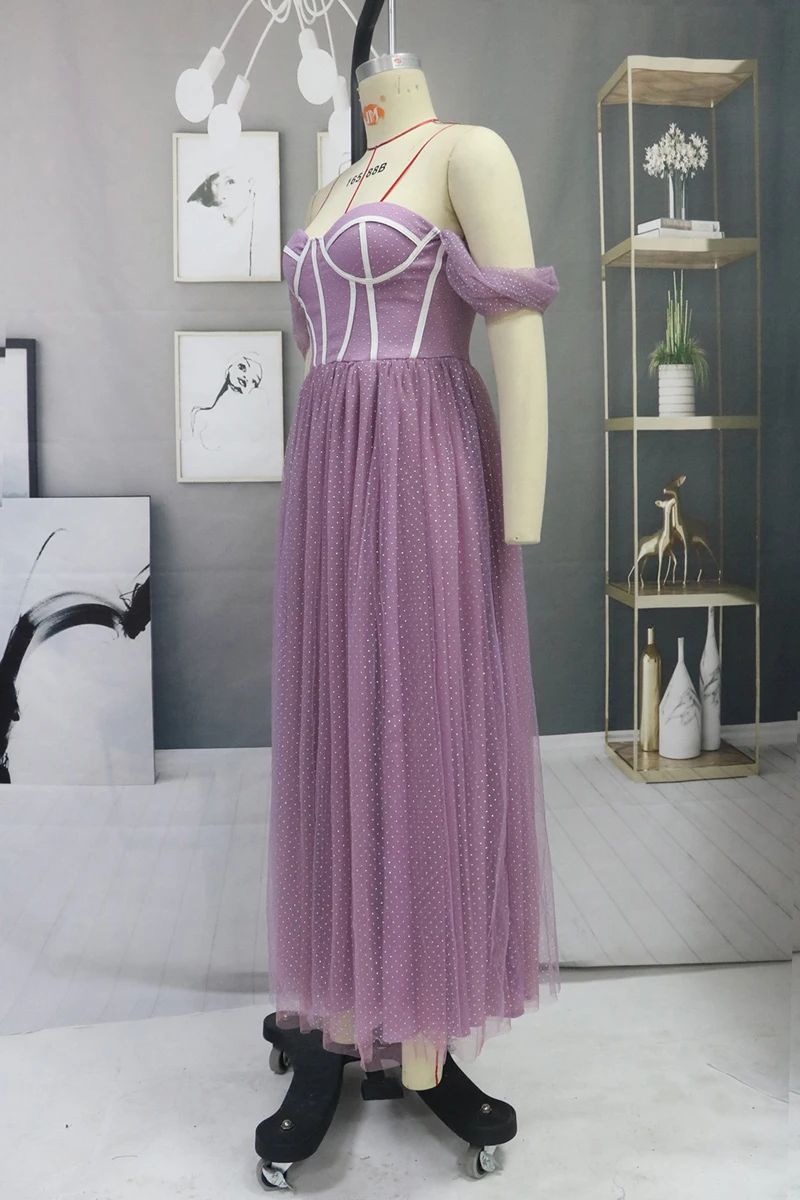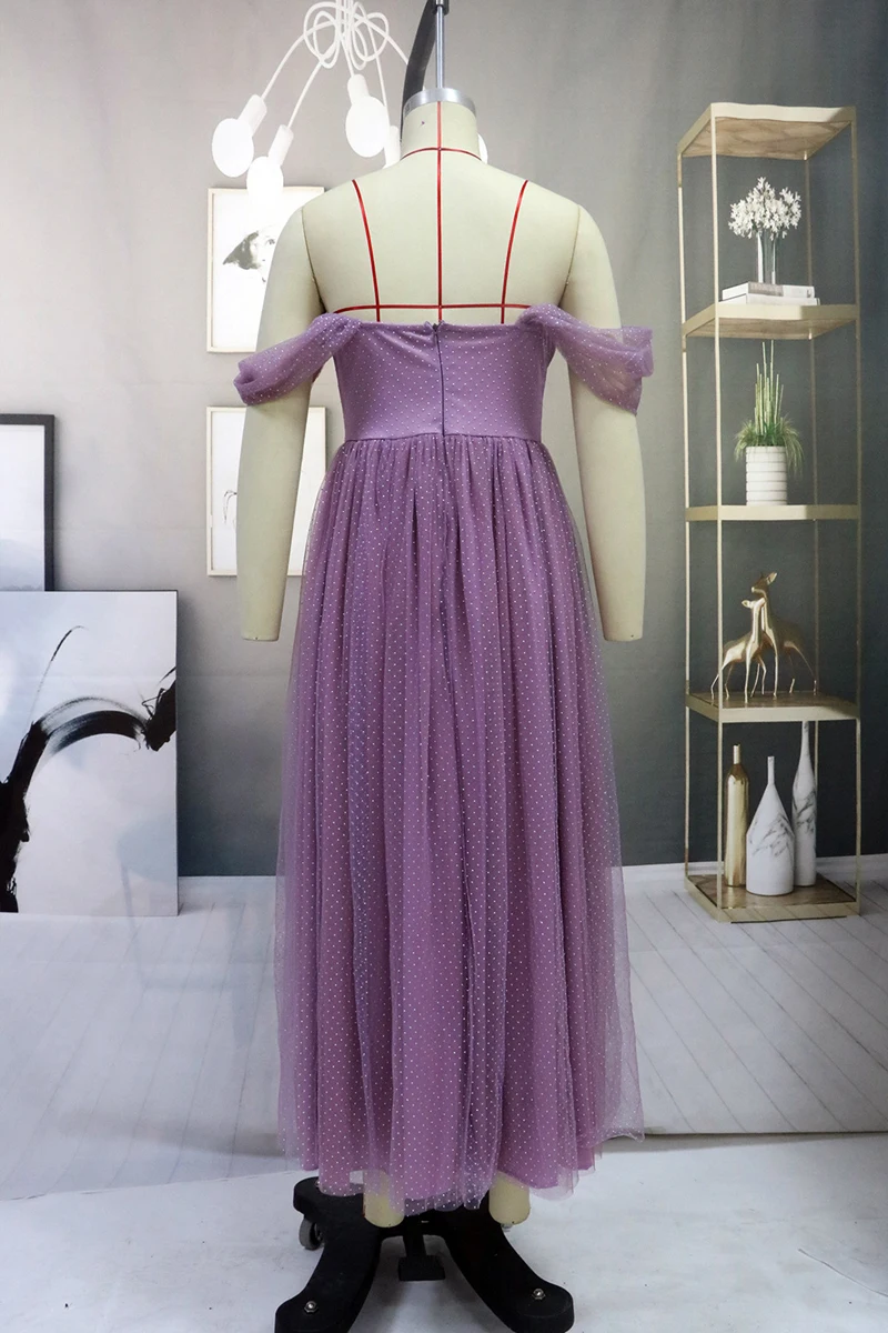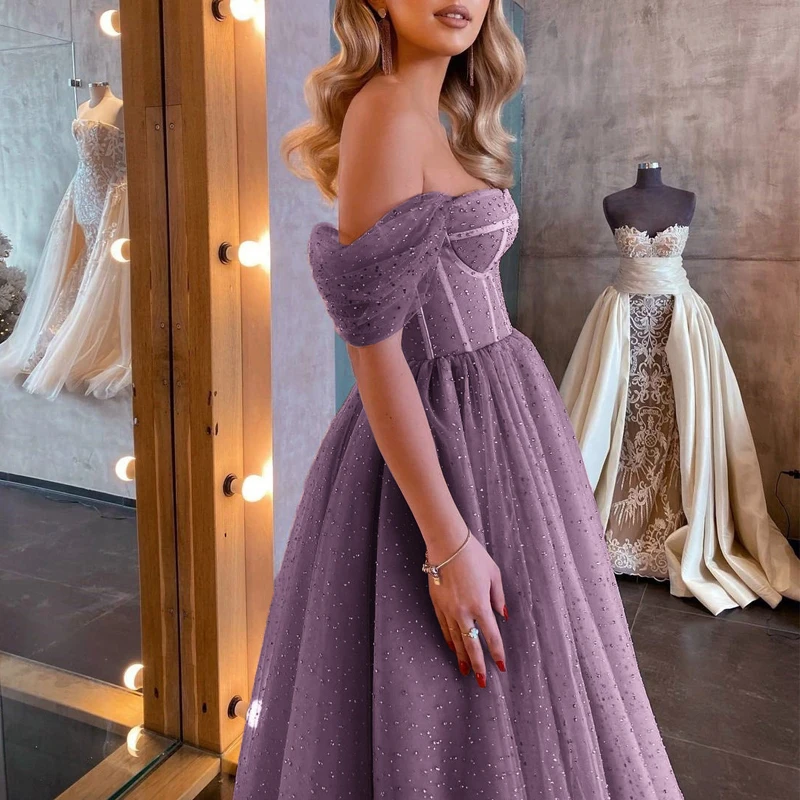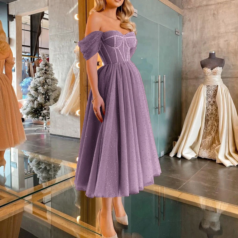 Women Retro Dress Fashion New Short Sleeve Solid Mid Length Dress Sexy Off Shoulder Purple Party Dress