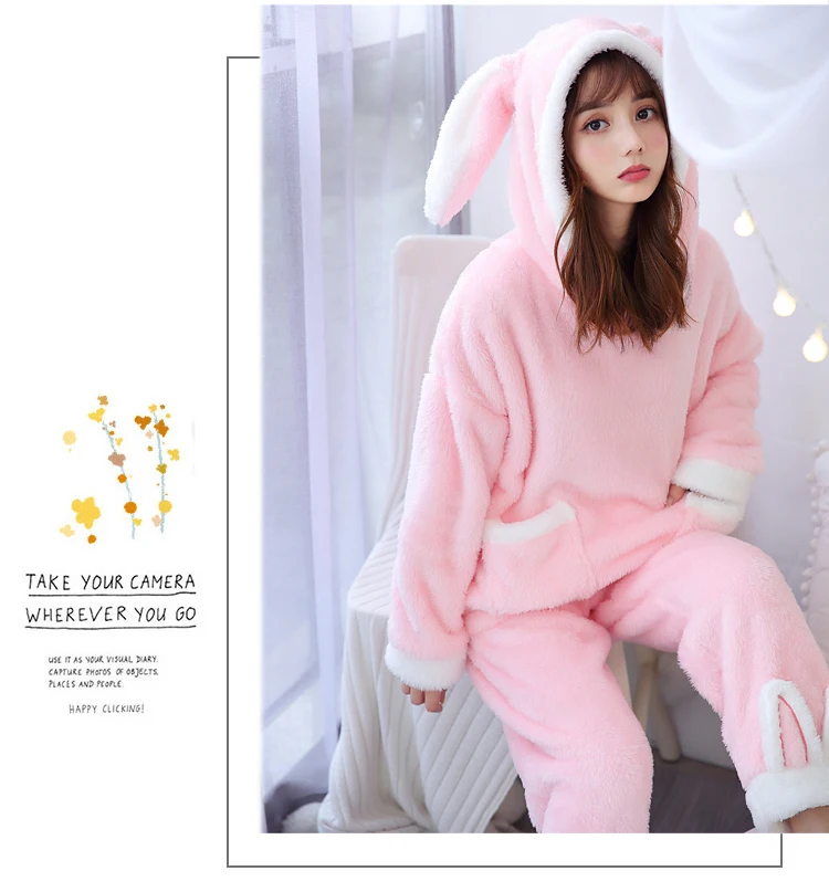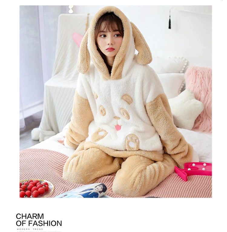 WAVMIT Winter New Women's Flannel Hooded Long Sleeve Pajamas Set Cute Leisure Women Sleepwear Set Gold Velvet Pyjamas Homewear