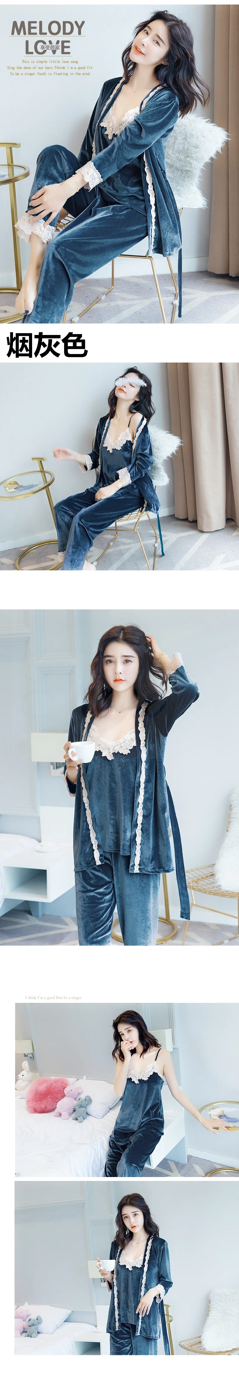 Autumn Winter Warm Pajamas Set Women Sling Deep Gold Velvet Sexy Homewear 3PCS Women Pajama Sets Long Pant Set Robe Women