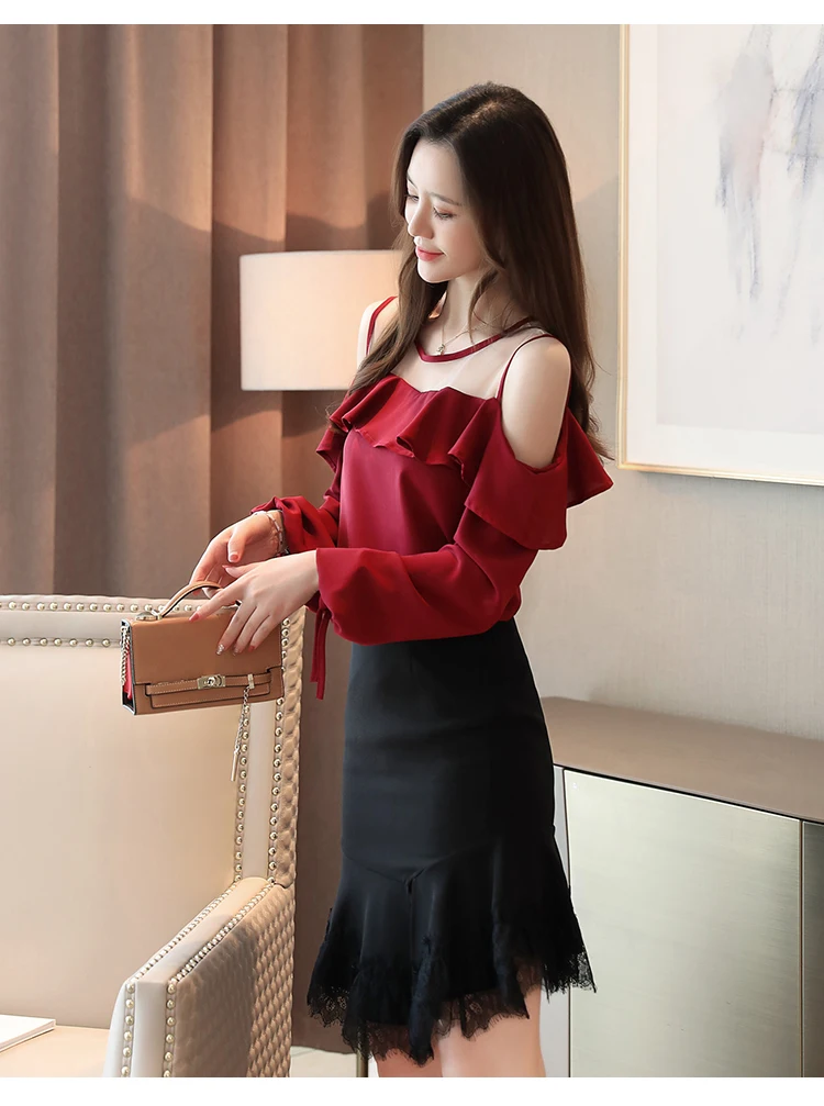 Casual Off Shoulder Tops Solid Long Sleeve Chiffon Blouse Blusas Mujer De Moda 2022 Autumn Women Tops and Blouse 6756 50