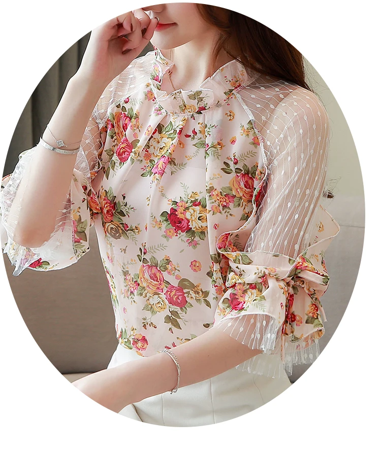Blusas Mujer 2022 Summer Women Tops and Blouses Camisas Mujer Floral Print Lace Chiffon Blouse Fashion Chic Women Shirts 4068