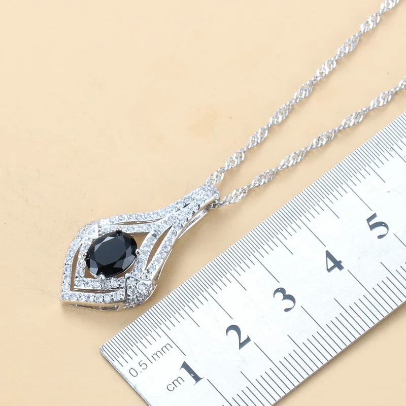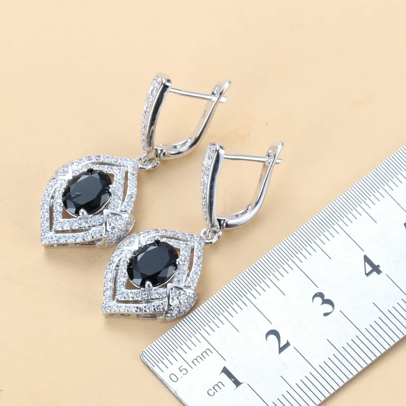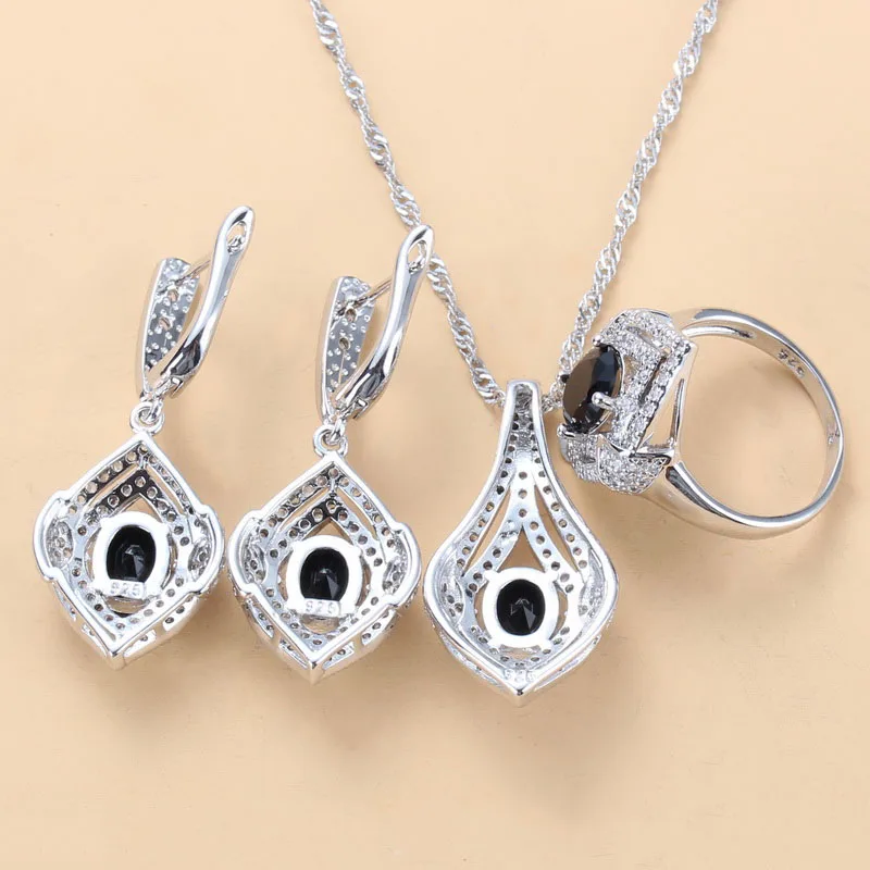 2022 New Trendy Jewelry Sets For Women 925 Mark Black Cubic Zirconia Dangle Earrings And Ring Necklace Sets Female Costume
